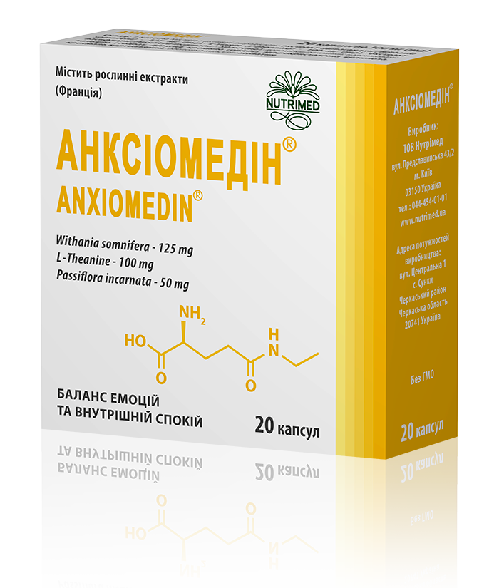 Рекомендації щодо застосування: АНКСІОМЕДІН® рекомендується як додаткове джерело біологічно активних речовин рослинного походження та L-тіаніну, з метою зменшення відчуття тривожності, неспокою, роздратування, відчуття внутрішньої напруги та коливання настрою. АНКСІОМЕДІН® сприяє підвищенню працездатності, зменшенню втомлюваності та не викликає звикання. Анксіомедін® сприяє зменшенню негативного впливу щоденного стресу на організм.