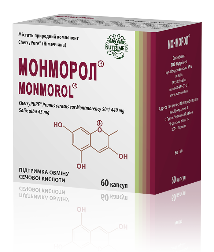 Рекомендації щодо застосування: МОНМОРОЛ® рекомендується як додаткове джерело антоціанів вишні сорту Монморансі та інших біологічно активних речовин рослинного походження, що сприяють зниженню рівня сечової кислоти при гіперурикемії.