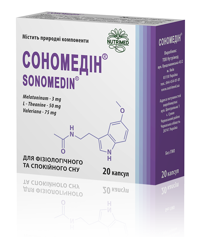 Рекомендації щодо застосування: СОНОМЕДІН® рекомендується як додаткове джерело біологічно активних речовин рослинного походження, L-тіаніну та мелатоніну, з метою покращення засинання, якості та тривалості сну. СОНОМЕДІН® сприяє полегшенню засинання, фізіологічному регулюванню циркадних ритмів, у т.ч. при тривалих подорожах; сприяє зменшенню негативної дії денного стресу. СОНОМЕДІН® не викликає звикання та важкого пробудження.